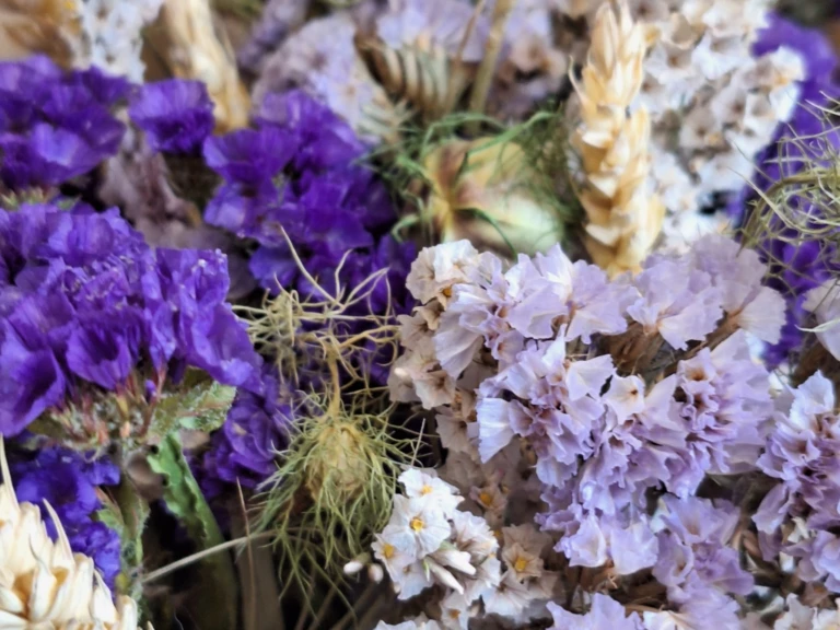 Cette approche, ancrée dans le respect de la nature, me permet de vous proposer des fleurs fraîches en circuit court. Chaque bouquet que je compose illustre ma vision du mouvement Slow Flower : un retour au rythme des saisons et au réel de la terre. Lorsque la saison froide arrive, mes fleurs séchées naturellement à la ferme prennent le relais. Elles offrent un instant floral en suspens, comme un écho de l'été et de mes parcelles dans votre intérieur.